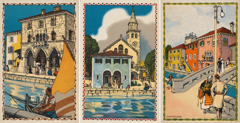 Hans Kalmsteiner sorgte für die malerische Ausgestaltung der Schau und entwarf auch eine Serie von Ansichtskarten zum Adria-Thema, die gleichsam eine Art „Ausstellung zum Mitnehmen“ waren.